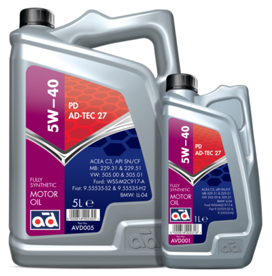 AD-TEC 27 5W-40 PD IS formulated primarily to meet the requirements of VW 505.01 for use in Pumpe Duse engines where fixed time & distance service intervals are recommended. The advanced formulation is a mid SAPS ( Sulphated Ash, phosphorous ands Sulphur) product which offers excellent engine cleanliness by preventing deposit build up. AD-TEC 27 is suitable for a range of vehicles where a 5W/40, C3 engine oil is recommended. These vehicles include: Fiat, Alpha Romeo, Chevrolet and Lancia.